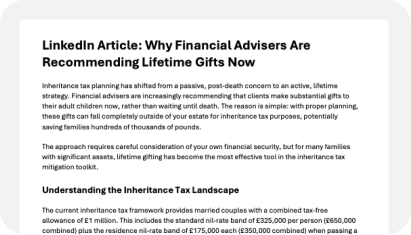 LinkedIn articles from advisor expertise, podcast episodes turned into content, case studies & client success stories
