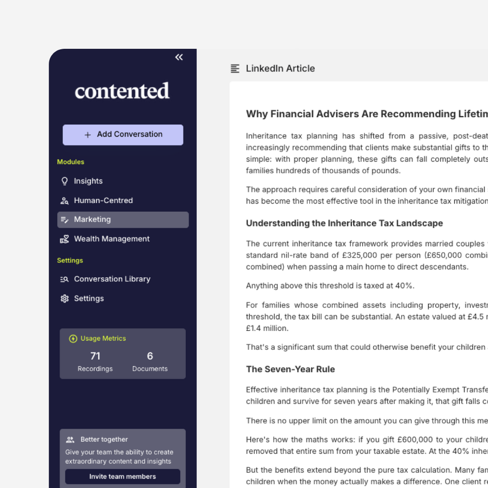Client meetings, strategy sessions, board discussions, advisor coaching, conference takeaways - Contented transforms them all into polished documentation.